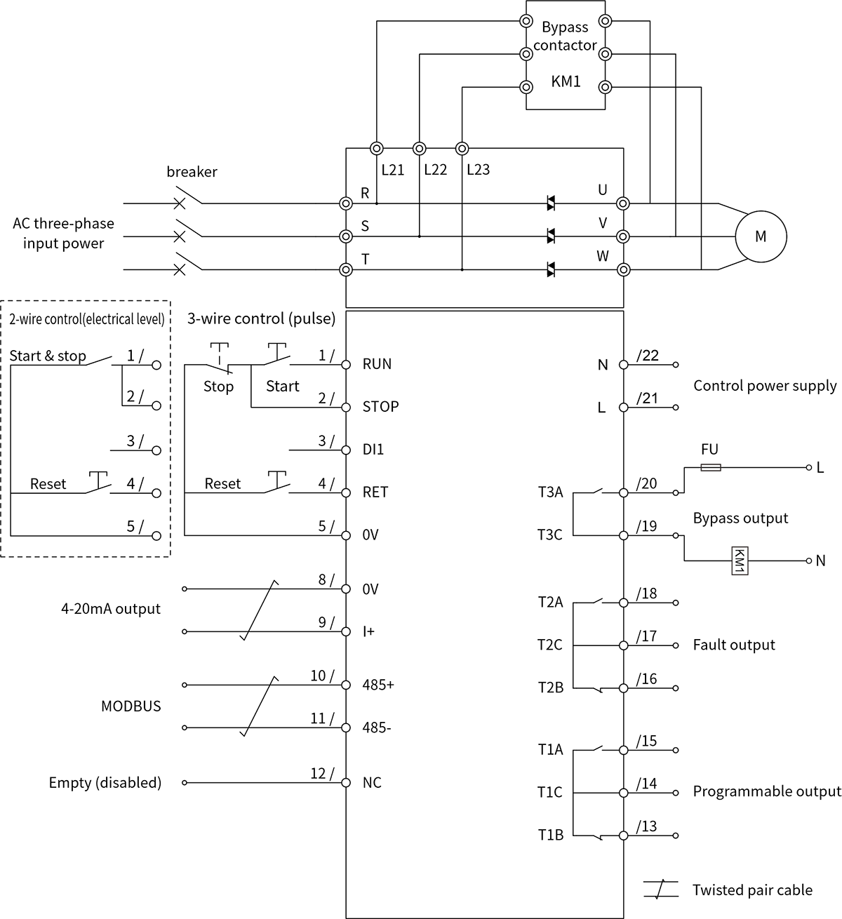 | RS 485 -16, 17, 18 | RS 485 communication terminal, connect multiple soft starters 16 is communication, grounding |