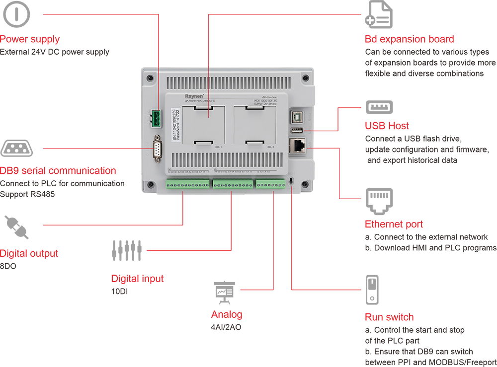 | | • Tacaíonn sé le feidhmeanna tionsclaíochta Idirlín agus is féidir é a oibriú go cianda; • Is féidir leis an bport líonra cláir HMI agus PLC a íoslódáil go díreach lena n-íoslódáil go héasca; • Tacaíonn an príomhchorp le cainníochtaí digiteacha agus analógacha, ar féidir iad a roghnú dá réir; • Tacaíonn sé le 2 leagan leathnaithe BD chun iad a oiriúnú go solúbtha do riachtanais éagsúla ar an láthair; • Úsáideann an chuid PLC ríomhchlárú ar nós na Seapáine |