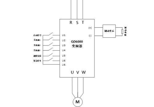 | Sa chóras seo, úsáidtear inverter RVE32 22KW chun an lártheifneoir 22KW a thiomáint, agus roghnaítear feidhm illuais an inverter chun rialú trí luas a bhaint amach, is é sin oibriú íseal-luas, oibríocht mheán-luas agus oibríocht ardluais. Baintear stad tapa amach tríd an aonad coscánaithe seachtrach agus an friotóir coscánaithe.