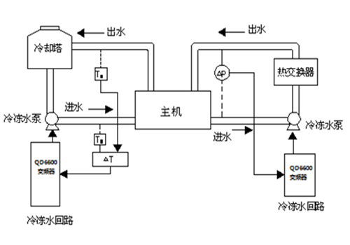 | 04 réamhrá córais: Sa chóras seo, tá dhá chaidéal uisce fuaraithe 110KW á dtiomáint ag dhá inverters D71 110KW, agus tá roinnt inverters D71 ann freisin a thiomáineann lucht leanúna (lena n-áirítear lucht leanúna faoi dhíon agus lucht leanúna túr fuaraithe). Sa chóras cúrsaíochta uisce fuaraithe, seoltar an comhartha 1 (comhartha teochta nó comhartha brú) den chuaird inlet uisce agus an comhartha 2 (comhartha teochta nó comhartha brú) den chuaird asraon uisce chuig an modúl analógach chun comhartha aiseolais analógach an inverter a fháil. Trí fheidhm PID ionsuite an inverter, déantar rialú uathoibríoch lúb dúnta a bhaint amach. | | ||||||||||||||||||